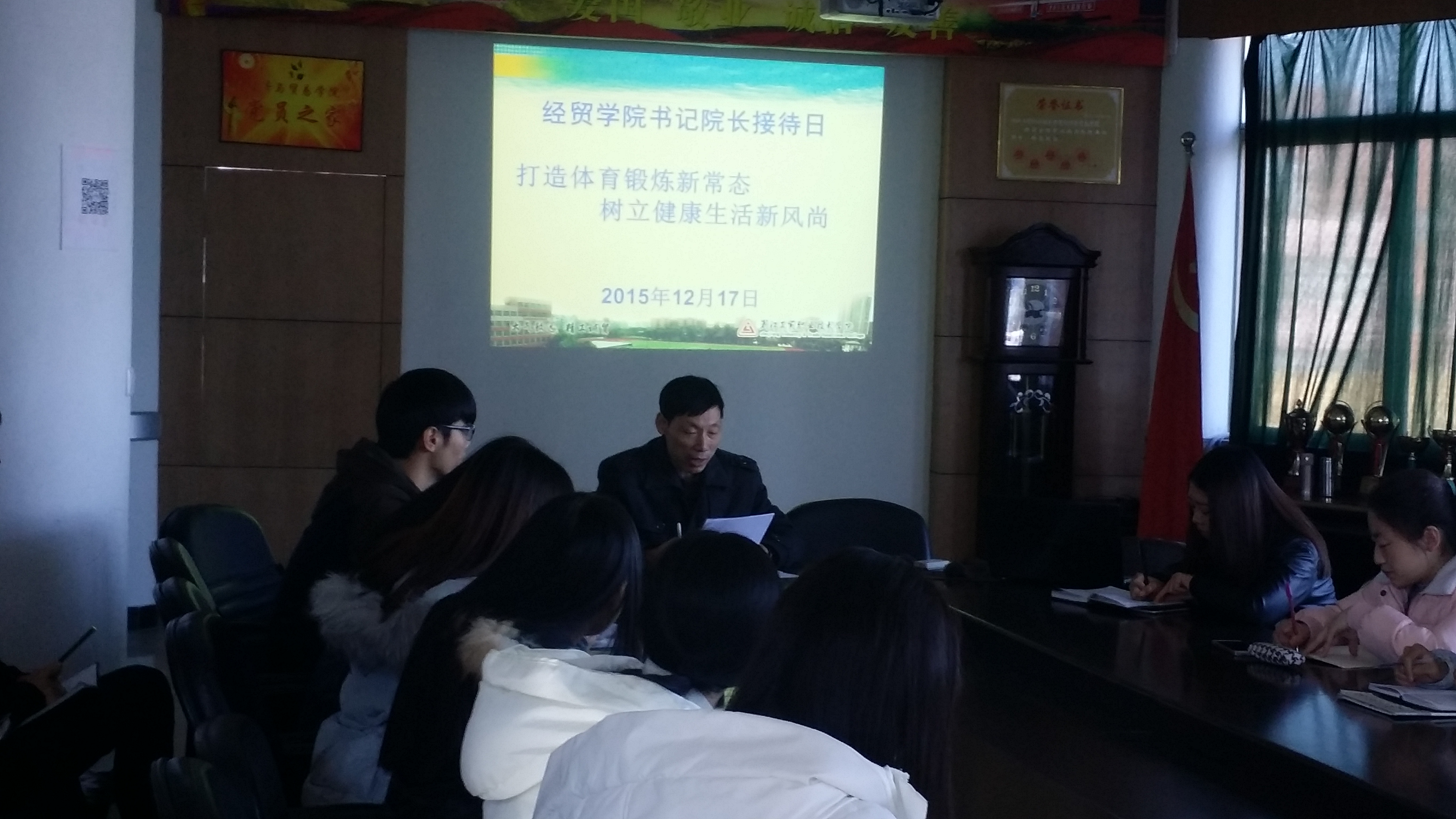 12月17日,经贸公司2015年秋季学期第二期“书记经理接待日”活动在1号教学楼六楼会议室举行。本期“书记经理接待日”以“打造体育锻炼新常态 树立健康生活新风尚”为主题,经贸公司党总支书记项光春、团总支书记高莎出席了会议,经贸公司团总支员工会员工干部、各班班长50余人参加了活动。