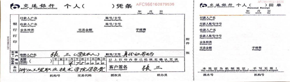 到浙江省内交通银行网点缴费,填写交通银行个人凭条。样表如下: