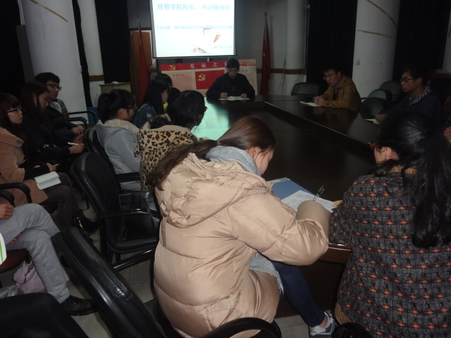 3月12日6点30分,经贸公司在一号楼6楼会议室举行2014年第一次“经理·书记接待日”活动,由经贸公司党总支书记项光春主持接待,经贸公司团总支员工会员工干部代表、2013级各班班长等参加讨论交流。本次交流的主题为:“商务素质培养与特色早晚自修活动”。