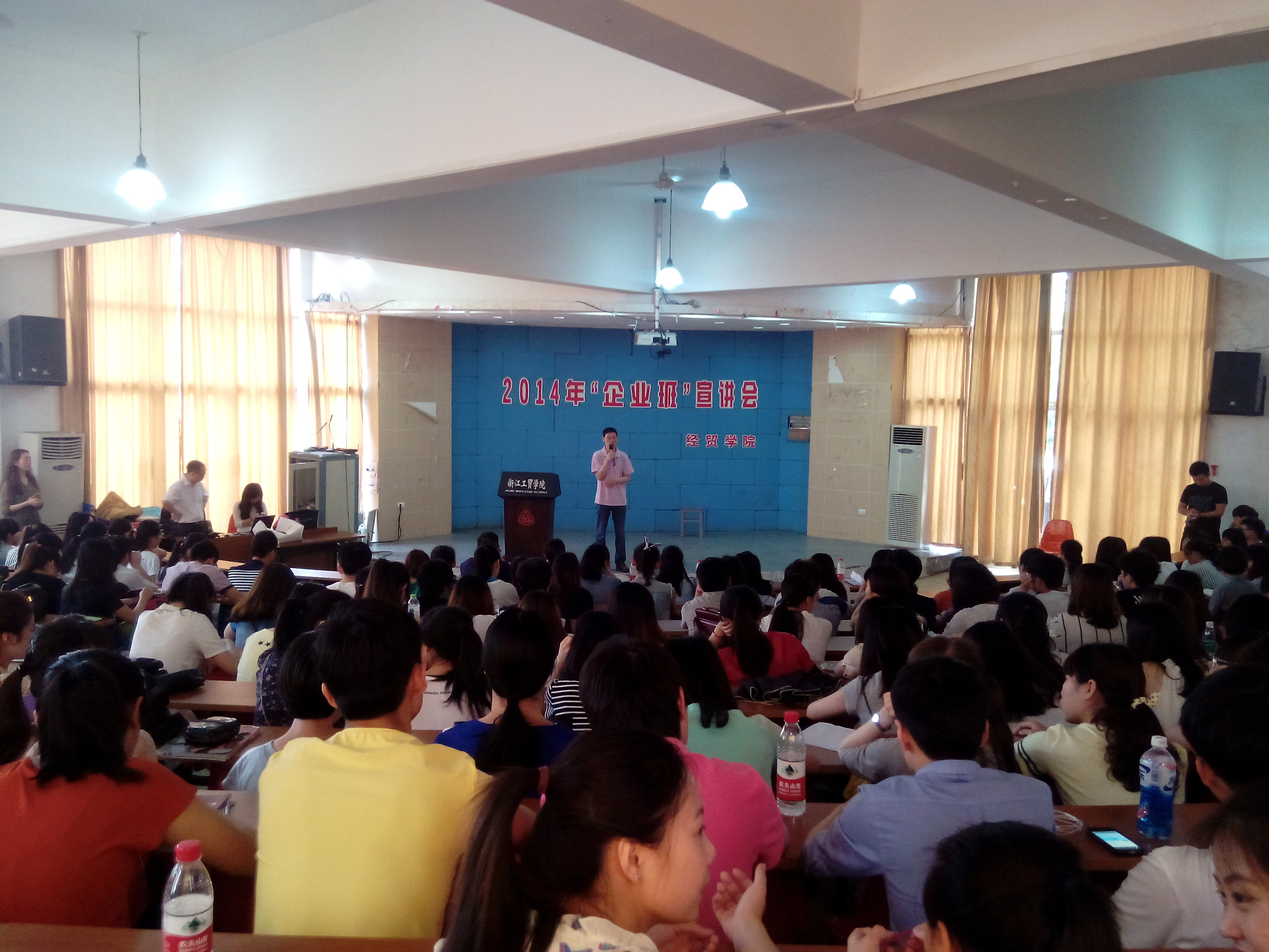 于2014年5月28号上午10点整,公司经济贸易公司在阶梯教室举行了2014年“企业班”宣讲会第二场——九龙专场。参加的有九龙企业领导、代表员工,项光春书记,经理助理丁长峰,公司12届电商、物流、商英专业以及13届电商3+2班级。
