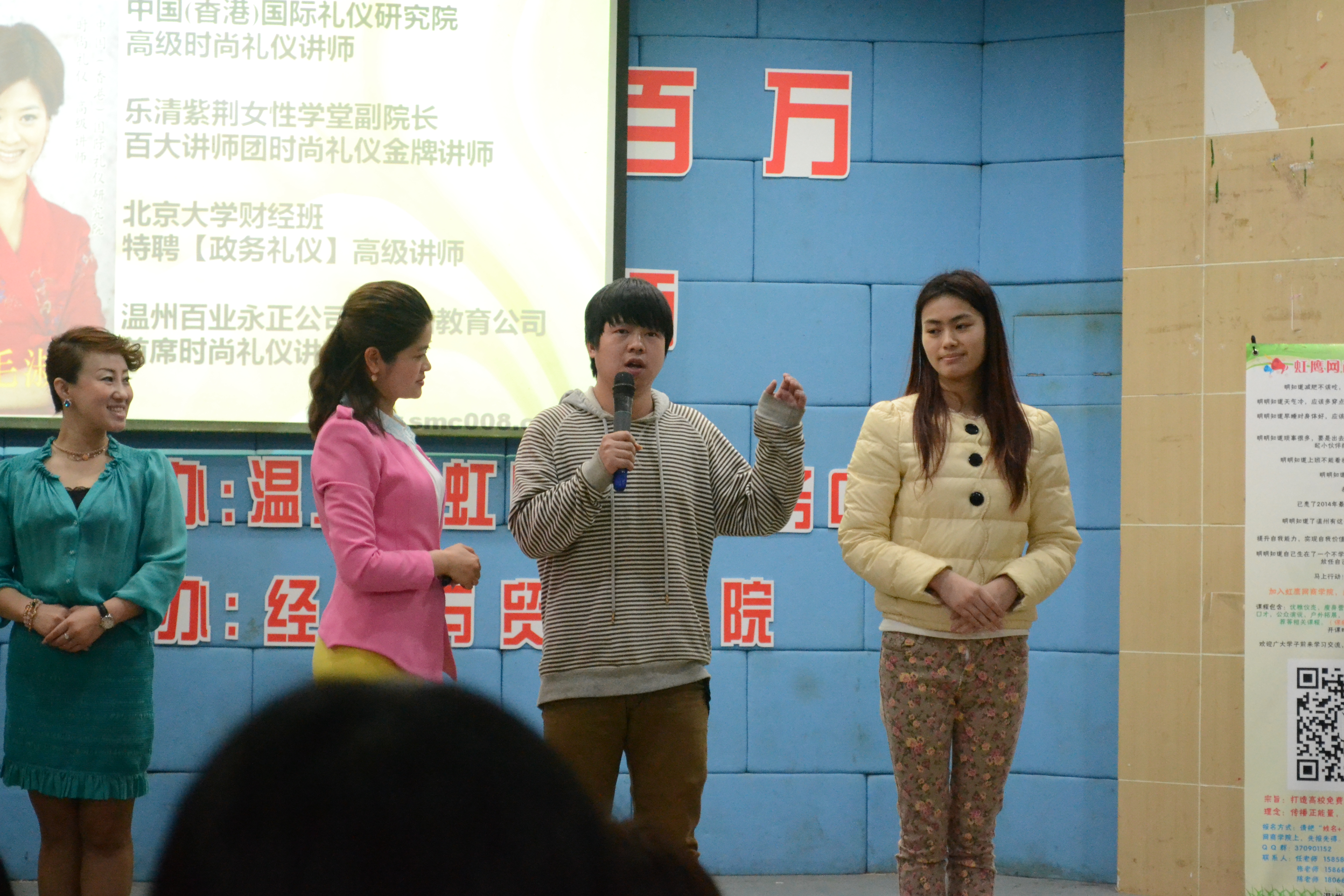 2014年4月8号,经贸公司为了打造高校免费学习分享交流第一平台,而开展了一次访谈形式的活动。本次活动邀请了管理公司教授张劲邺老师、党支部书记发起人任虹琴、经贸公司辅导员老师向政、周妍妍。还有毛淑慧老师以及所有大一员工。主办方是温州市虹鹰企业服务中心,由毛淑慧主讲,活动以访谈的形式进行,主要讲论些礼仪等相关知识。