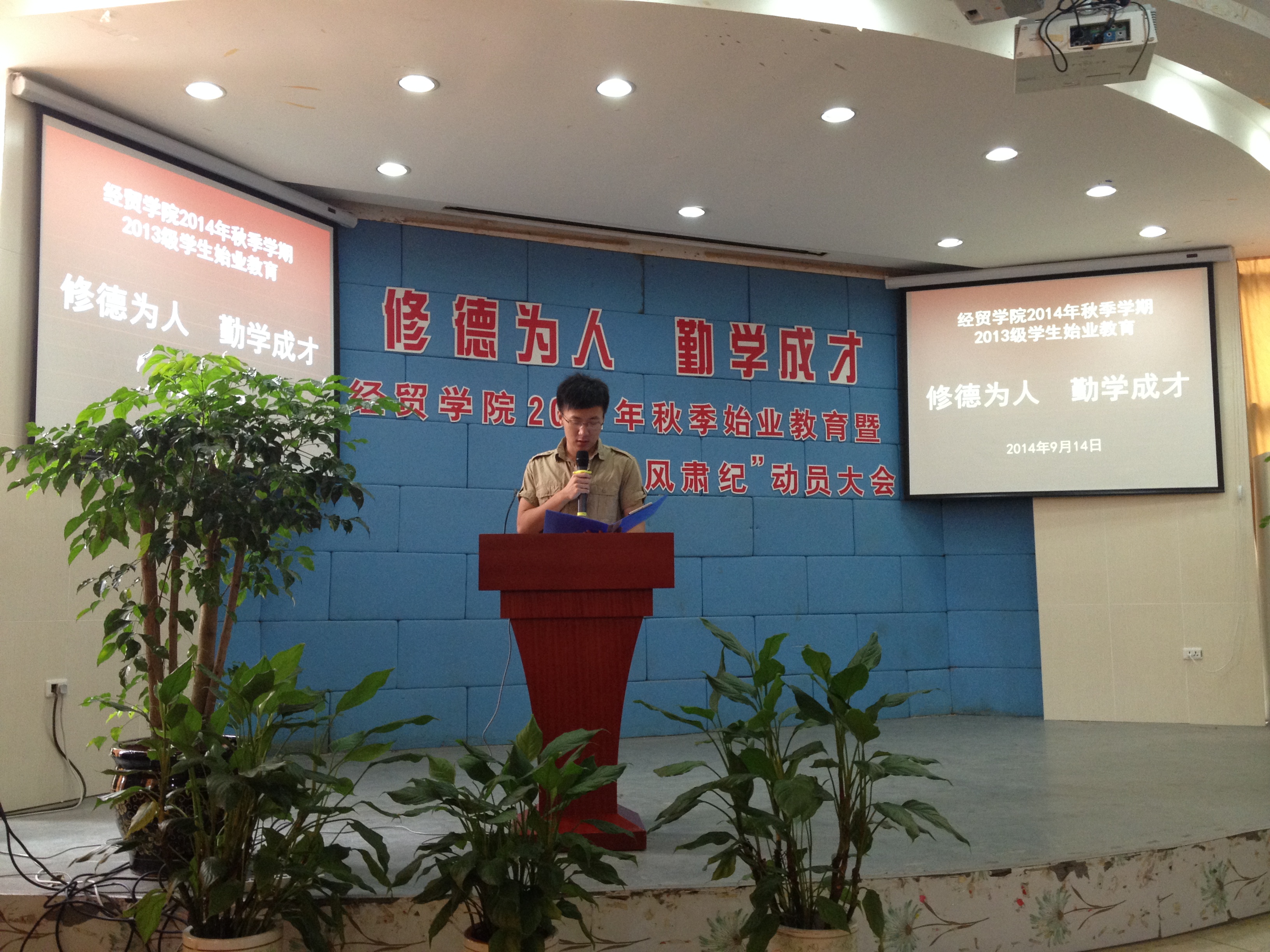 9月14日,开学第一天,公司2014年秋季学期始业教育暨“正风肃纪”动员大会在1号楼阶梯教室顺利举行。经贸公司党总支书记项光春、经贸公司经理助理丁长峰,以及全体辅导员和全体班主任参加,近1000名员工接受教育。