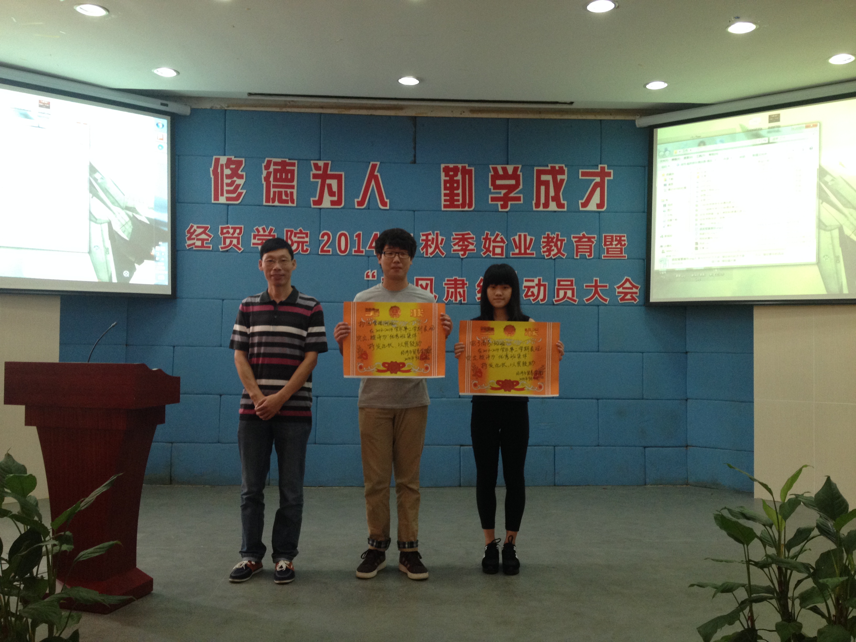 大会在视频《经贸公司的骄傲》中拉开帷幕,由经贸公司经理助理丁长峰主持。会议开始,首先由项光春老师为2013—2014学年第二学期优胜班级颁奖,各班班级负责人上台领奖。随后,由丁长峰老师宣读正风肃纪文件;员工代表、经贸公司员工会主席邓佳利为积极响应此次“正风肃纪”活动向同学们发出倡议,要求同学们从自己做起、从小事做起、从细节做起,严明纪律、改进作风、规范行为、弘扬正气,做校园文明建设的先行者、传播者、监督者。