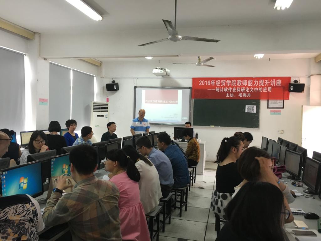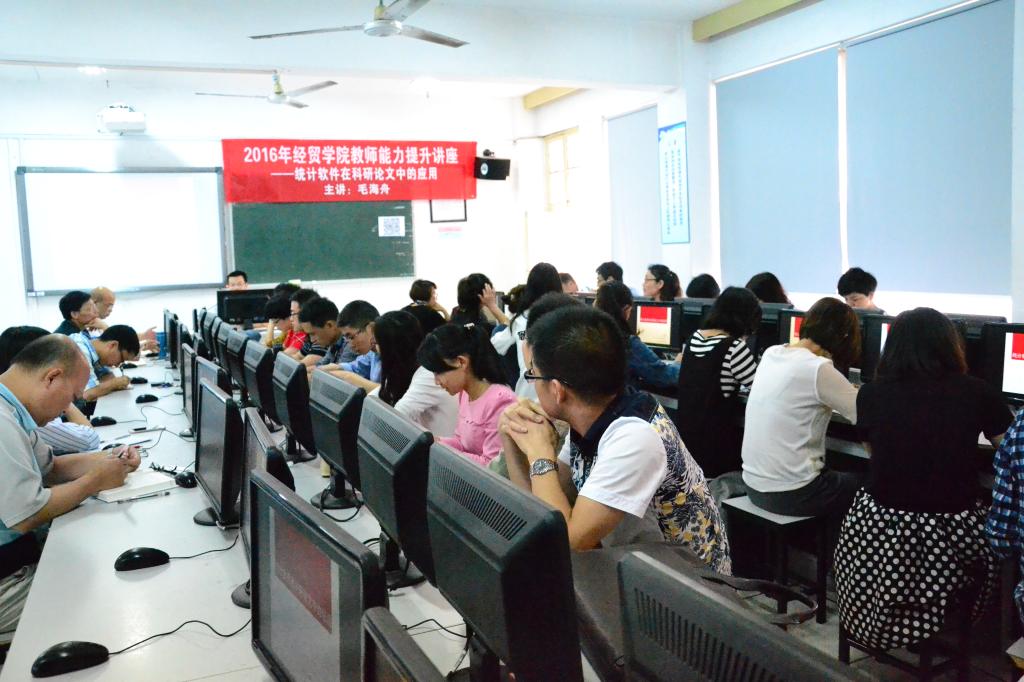 为了进一步提升教师的整体科研水平和科研能力,增强教师在科研中运用统计分析的能力,提高研究质量,针对公司教师定量研究方法和手段相对薄弱的特点,6月3日下午,经贸公司举办教师科研能力提升系列讲座,特邀人文系毛海舟老师作了题为《统计软件在科研论文中的应用》的讲座。讲座由经贸公司经理汪焰主持,全院教师参加了讲座。