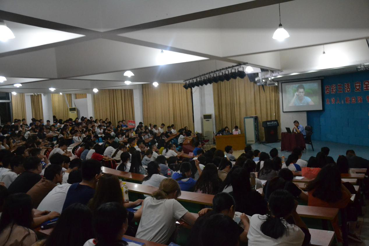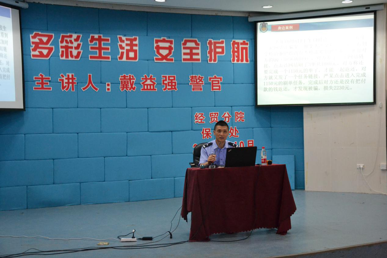 为进一步提高大一新生的安全防范意识,不断提高对各类诈骗的识别能力,2017年10月11日晚,经贸分院联合保卫处在阶梯教室为分院17级新生举办了“多彩生活·安全护航”为主题的安全知识讲座。本次讲座由温州市公安局戴益强警官主讲,主题鲜明,内容丰富,现场反响热烈,同学们深感获益良多。