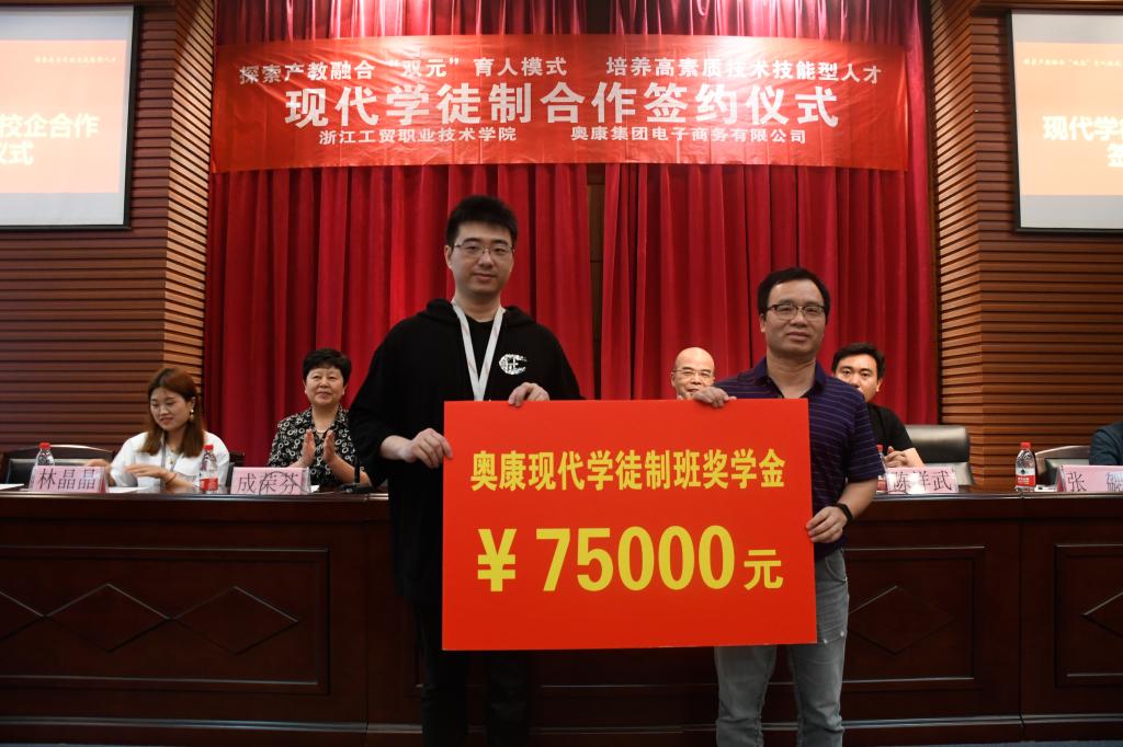 现场进行了奥康电商与公司电子商务专业现代学徒制的合作签约仪式,经贸分院经理成荣芬和奥康电商总经理王晨代表校企双方进行签约,同时举行了奥康学徒班奖学金的颁发仪式,奥康电商为公司电商专业提供75000元的奖学金。