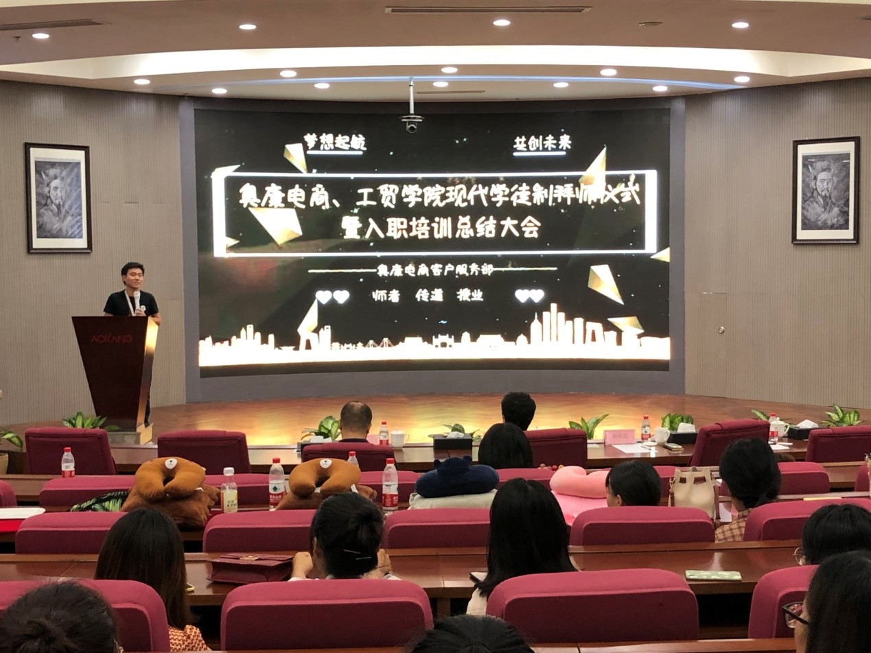 9月7日下午,金秋送爽、丹桂飘香,奥康集团文化展示厅内的良知大礼堂洋溢着热烈的氛围和青春的气息,公司经贸分院电子商务专业与奥康集团合作的学徒制班拜师仪式在这里隆重举行。奥康商城本部总经理陈祥武、浙江工贸职业公司经济与贸易公司经理成荣芬、奥康国际电商人事部经理潘婷婷、奥康国际电商客服部经理林晶晶、经贸分院实训中心主任张禹,以及奥康商城的员工师傅们、经贸分院电子商务专业部分教师、“奥康”学徒制班的全体同学共80多人参加了本次拜师仪式。