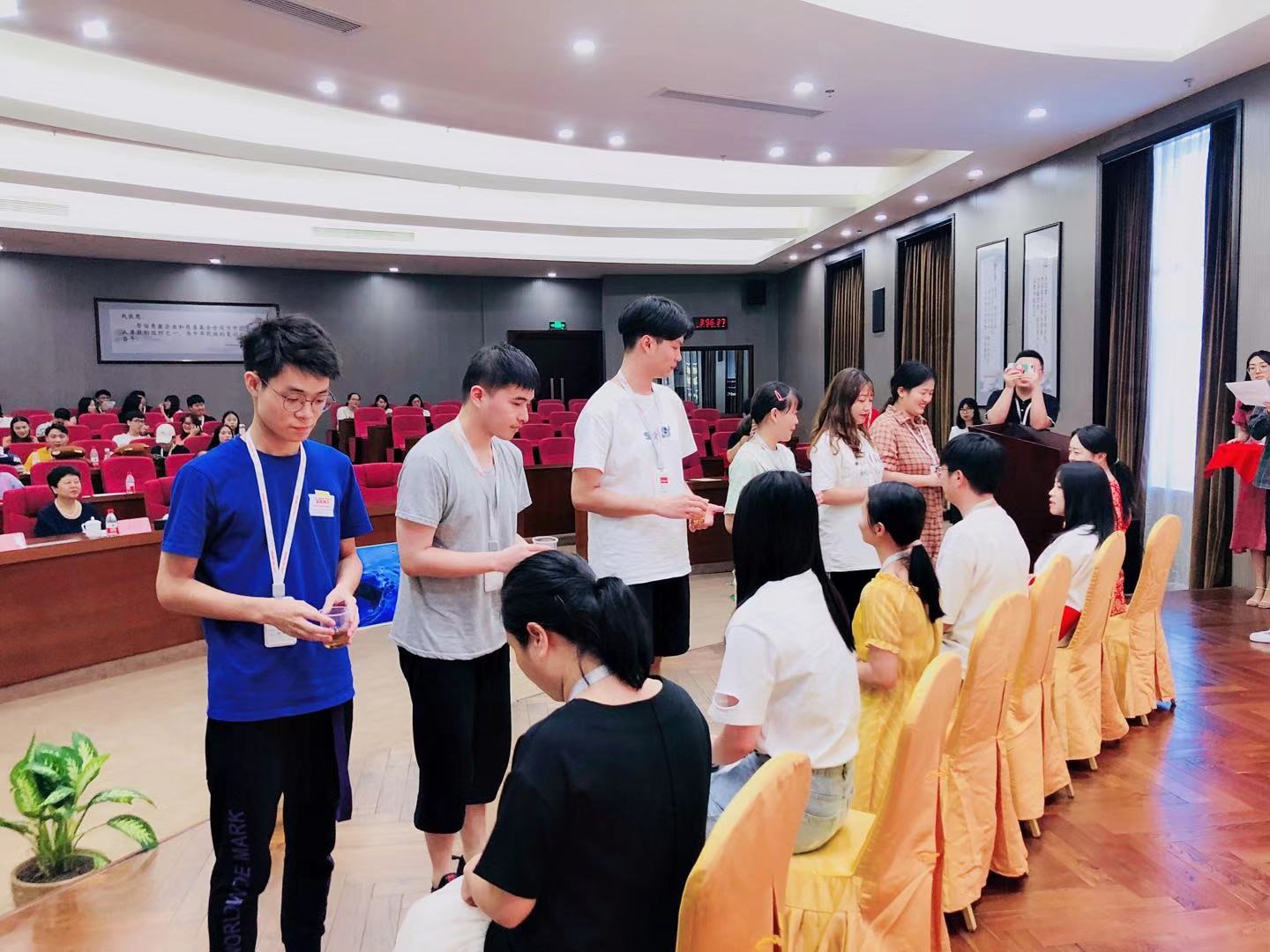 第四阶段是隆重而庄严的拜师仪式:奥康企业师傅们先上台就坐,现场抽签选徒弟,选中的徒弟给师傅们敬茶,完毕后师傅们给徒弟们入门礼物,然后师徒签订师徒协议;拜师仪式分5批进行。