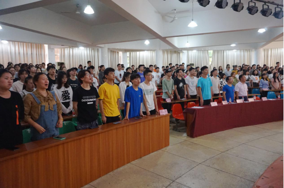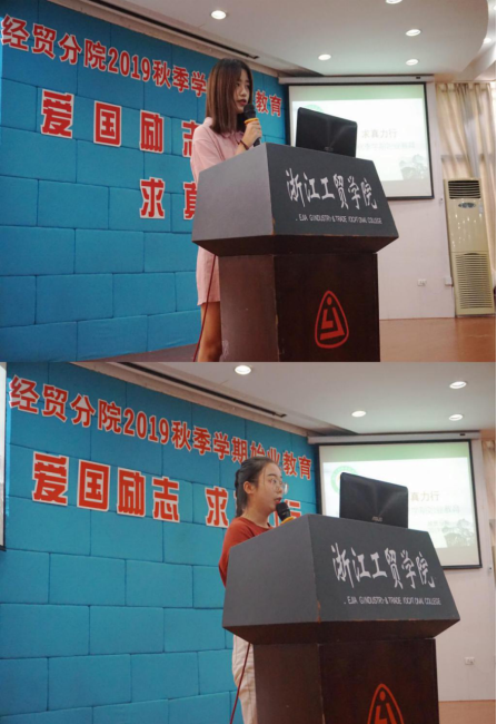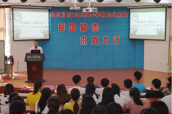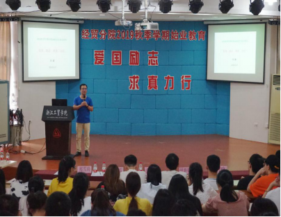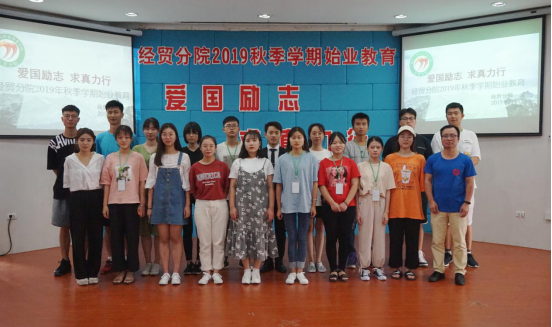 为了弘扬爱国主义精神,立鸿鹄志做奋斗者,9月7日下午,经贸分院在阶梯教室召开了以“爱国励志 求真力行”为主题的2019年秋季学期老生始业教育大会。出席本次活动的有经贸分公司党总支书记张勰、经贸分院副经理陈碎雷、辅导员向政、周妍妍、郑雪琦,另外17级与18级老生分为两批参与了此次会议。