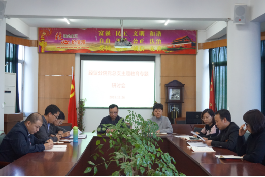 11月26日下午,经贸分院“不忘初心,牢记使命”主题教育专题研讨会在一号楼六楼会议室举行。经贸分公司党总支书记张勰、党总支委员参加会议,分院经理、二级党支部书记列席会议。此次专题研讨会分为两个阶段。会议第一阶段由党总支书记张勰主持,会议第二阶段由党总支组织委员周妍妍主持。
