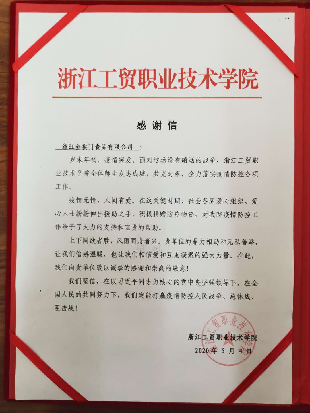 2020年4月30日,经济与贸易分院校企合作企业浙江金拱门食品有限公司主动向公司无偿捐赠232瓶免洗消毒凝胶,助力公司开展疫情防控工作,经济与贸易分院代表公司接受捐赠,并向企业发去感谢信。