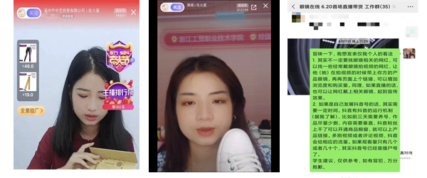 在德纳这次直播活动期间,肖湘同学除了前期为企业活动的组织积极提供建议外,还在商英专业王觅老师的带领下,前往德纳公司与公司团队共同参于此次线上眼镜展会。不仅将所学直播知识运用于直播实践,还在现场调整直播的硬件设施,给企业主播提出自己的经验,直播过程中也时刻帮助主播控制场面。肖湘同学参与的德纳线上展会,观众达到6000多人,卖出眼镜50多件,送出礼品20多份。肖湘同学的出色表现,解了企业的燃眉之急,受到企业朱经理的充分赞扬与肯定,也受到到了众多在线眼镜行业销售人员的好评。