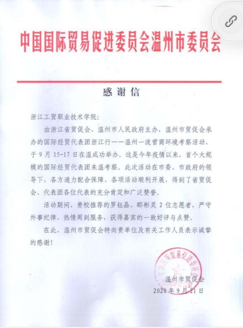 活动期间,公司TapTap点点国际经济与贸易专业1801班的两位员工,罗钰晶、郦彬灵,全程参与这次贸促会的志愿者活动,严守外事纪律、热情周到服务,获得温州贸促会的实名表扬。两名志愿者员工全程参与活动,包括:前期人员名单核对、资料整理、志愿者(翻译)、动车站接站、外事接待、以及会议准备。员工在做志愿者活动的过程中,每一次对外宾真诚的问候、每一次热心的帮忙都换来了他们发自内心的感谢,展现了公司员工良好的风貌。国贸专业这几年一直积极选派优秀员工参与温州贸促会、温州进出口展等志愿者活动,和企业、行业共同培养真正全面发展的复合型贸易人才。