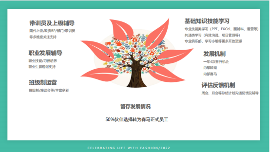 接着,讲到公司毕业生在企业实习时的职业发展路程,森马电商会对刚入职的实习生进行带训员及上级辅导、职业发展辅导、班级制运营、基础知识技能学习、发展机制、评估反馈机制,并且每个人的发展情况的会留存。同时,森马电商有着和谐的工作氛围,要是遇到工作方面的问题也会有前辈指点,并且在实习期间薪酬也是非常丰厚的,有实习补贴+餐补+住宿。良好的工作环境,能让员工更有饱满的工作热情和持续的工作动力,并且能够使其更加全身心地投入到工作中去,所以森马电商无论是办公中心还是餐厅、宿舍楼都是非常优越的。
