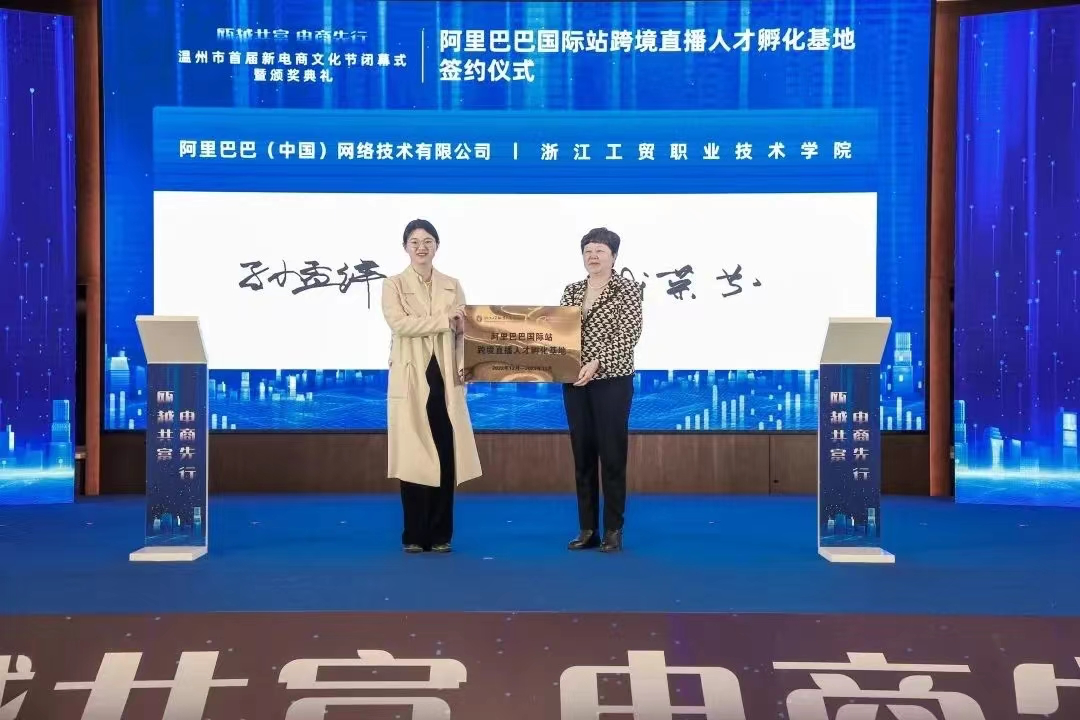 2023年4月7日,在温州市商务局举办的温州市首届新电商文化节闭幕式上,阿里巴巴国际站校企合作负责人孙孟洋与TapTap点点经理成荣芬,为达成阿里巴巴国际站跨境直播人才孵化基地的合作,顺利签约、授牌。
