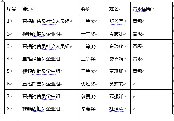 本次大赛从市级选拔赛到省级决赛共历时4个多月,省内近3000名选手竞赛角逐,公司电子商务专业组织师生共40人参赛,充分利用课外时间认真筹备,并借助于“短视频创作”课程和“直播电商”课程,积极与企业开展合作,探索课赛融合和项目化教学。在温州市赛阶段公司有22名师生获奖,之后更是越战越勇,最终荣获浙江省省赛“视频创推员”和“直播销售员”赛道一等奖2项,有5名参赛选手成功晋级全国总决赛如下表所示。