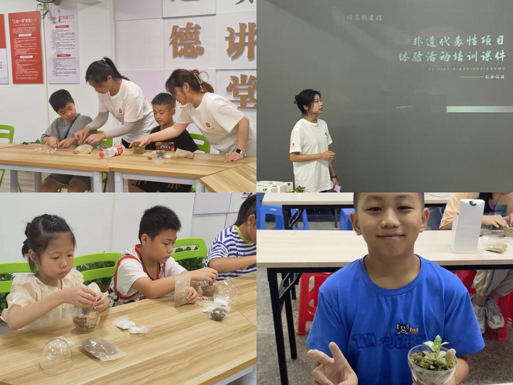 五组队员们分别来到了吕浦社区、桃花岛社区、蒲源社区、宏源社区等十个社区,向社区的小朋友们介绍了本次授课内容——温州盆景。