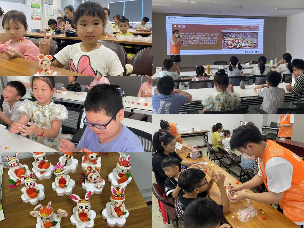 五组队员们分别来到了吕浦社区、桃花岛社区、蒲源社区、宏源社区等十个社区,向社区的小朋友们介绍了本次授课内容——米塑。