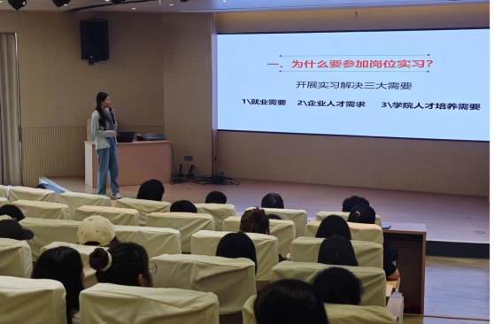 随后,实训中心教师万晓云进行发言。她先介绍了本次岗位实习的意义,并分析本次岗位实习合作企业的数量与参与人数。进一步,她详细讲解了员工在企业实习过程中的成绩评分机制和毕业答辩的相关事项,提醒同学们要认真对待实习过程中的每一个环节,努力提升自己的综合素质,希望员工能在实习过程中有所收获。