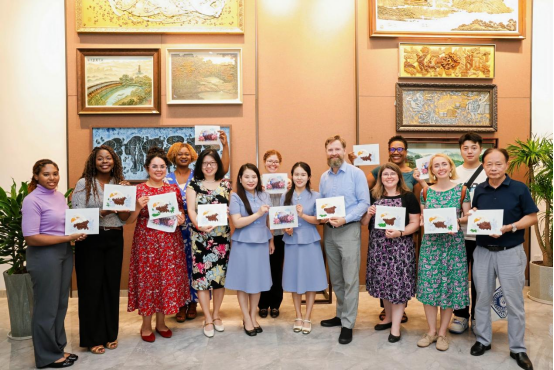 在浙江创意园,美国友人们来到瓯绣、瓯塑、瓯窑、木活字印刷教育实践基地一一打卡,详细了解温州地域传统文化,以及非遗技艺的工艺、历史、传承与创新,并深度体验了郑央凡老师创作的《中美文化之韵》瓯塑作品现场制作,大家在体验后纷纷表示赞叹不已,感叹中华文化之美。