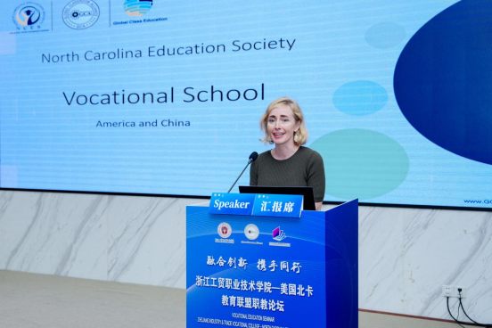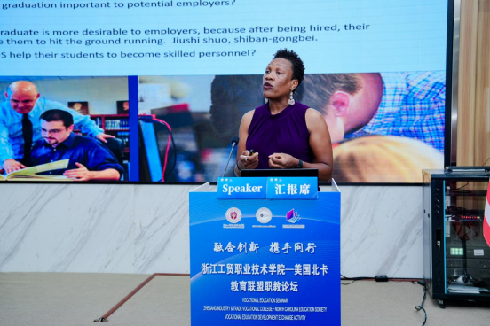 美国北卡职教联盟教师代表帕玛拉·伊利西亚·米切尔针对美国职业教育人才培养展开分享。对于商公司的员工,公司除了开设工商管理、创新创业、国际商务、市场营销及销售等课程之外还会设置实操训练课程和岗位实习,以此来帮助员工提升商业技能。对于工程公司的员工,教师在教学时会将与行业相关的实操项目带入课堂,还会利用最新的工程工具来完成实际项目引导员工学习最新技能。