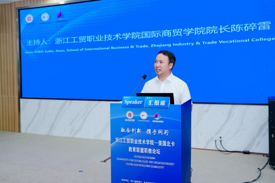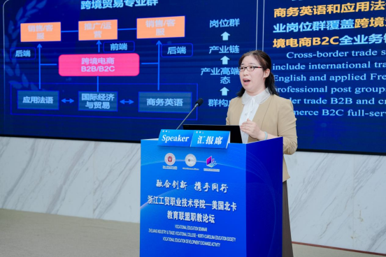在主旨报告阶段,浙工贸商务英语专业主任王星远在《跨越国界的商业桥梁——探索跨境电商的无限可能》报告中,从中美跨境电商现状、跨境电商人才培养、未来的合作展望等方面展开分享。她指出,浙工贸从运营与直播两个方面培养跨境电商专业员工,员工已成功为温州80余家中小微企业提供跨境电商店铺运营与直播服务。她希望,双方将在课程共建、案例共研、技术共享等方面开展更加深入的合作。
