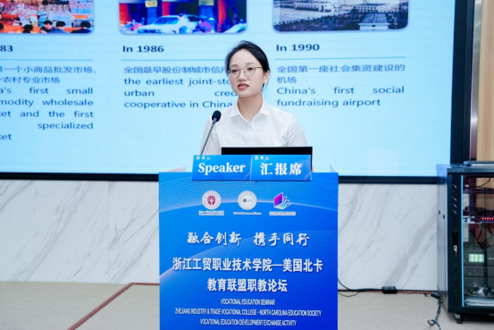 集团商务英语专业教师肖如孟针对温州改革开放历程培养展开分享。她从改革先锋、精彩蝶变、成功关键和未来展望等四个方面讲解了温州改革开放过程中的发展与变化。她认为,温州改革开放的成功关键一方面在于“永嘉学派”、“百工之乡”、“数学家摇篮”等丰富的文化底蕴,另一方面在于敢为人先、大胆突破的和创新创业精神。温州的改革开放故事让参会嘉宾深受触动。
