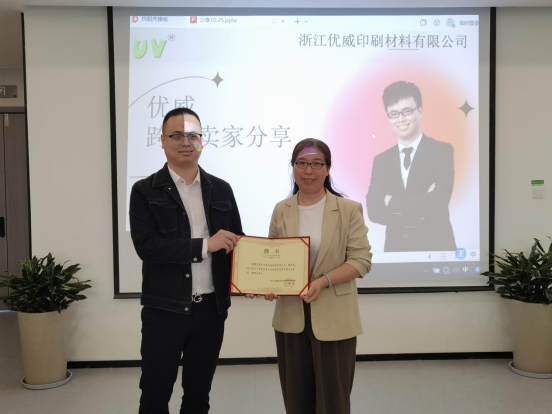 同时,王星远老师还为浙江优威印刷材料有限公司总经理蔡欢迎颁发了企业导师聘书,进一步加深了公司与企业的交流与合作。随后,企业负责人蔡欢迎为员工开展了以“优威跨境卖家分享”为主题的经验分享。