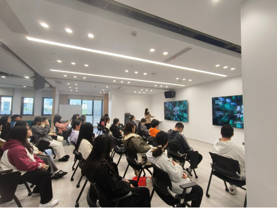 最后,森马集团的杨经理与新生们在企业会议室开展了企业座谈会。她详细讲解了森马集团的业务情况以及公司与电商的深度融合,让同学们对森马集团有了更加深入的了解。杨经理也在最后重点讲解了与同学们息息相关的问题,关于森马集团的岗位需求与全职招聘流程,也多多鼓励同学们积极参与森马的兼职锻炼机会,深入了解直播行业并尝试接触互联网运营与发展。