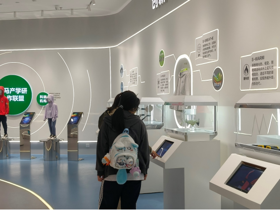 在负责人的带领下,同学们首先参观了介绍森马集团的展区,其中包括品牌介绍、企业经营理念、企业园区沙盘、企业成就等部分。同学们悉心聆听讲解,认真观摩展品,对森马集团的底蕴与实力建立起初步认知。紧接着,同学们来到了森马新兴技术的展区,这里集中展示了一系列服饰领域前言技术成果与创新运营模式。此外,森马色彩系统、数字换衣等新兴技术更是让同学们大为赞叹,切实领略到森马集团于科技创新驱动下的蓬勃活力与广阔前景。