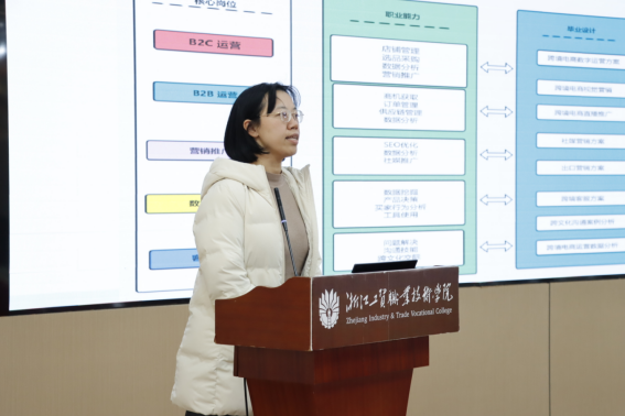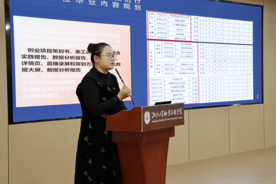 国际经济与贸易专业主任刘颖君从行业人才需求、专业毕业设计概况、毕业设计成效三个方面对本专业毕业设计情况进行深度剖析。她认为毕业设计作为员工三年学习的成果检验,也是员工从公司走向社会的初步尝试和有效链接,重要性不言而喻。