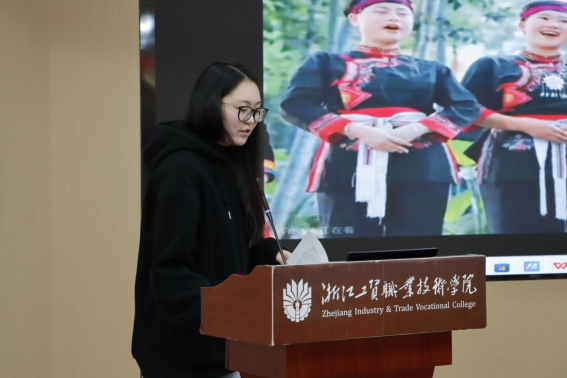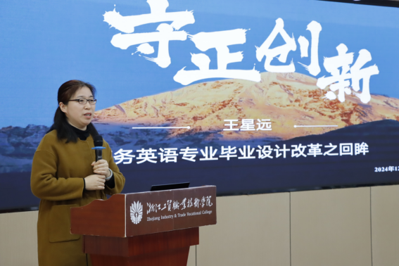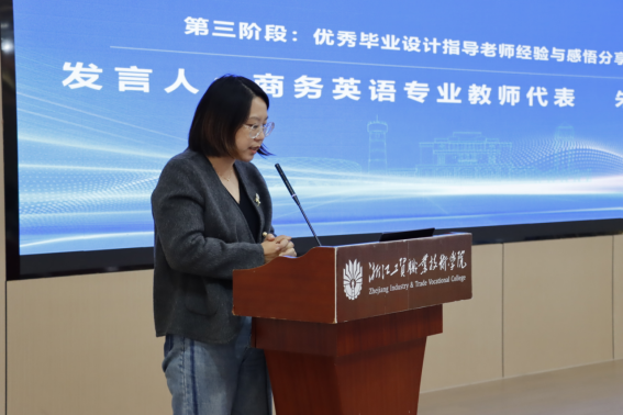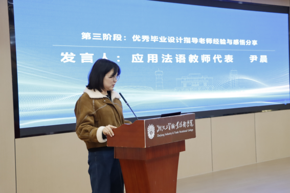 商务英语专业教师代表朱杨琼从员工毕业设计选题、制作过程以及知识产权教育与思政融合三方面进行专业化和具体化分享,她希望通过专业化指导,培养员工的专业技能、创新能力与职业道德,帮助员工在专业领域实现自我价值。