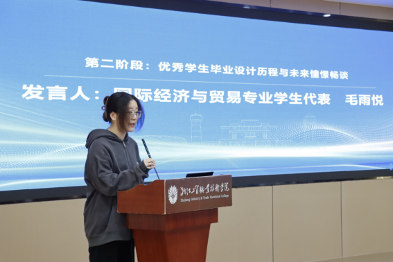 商务英语冯垚、国际经济与贸易毛雨悦、应用法语徐妍分别作为专业优秀毕业设计员工代表就毕业设计选题背景、完成过程、收获以及未来就业方向进行分享。他们一致认为,在毕业设计完成过程中收获良多,专业技能与职业素养的提升,让她们可以更从容地面对以后的学习与工作。