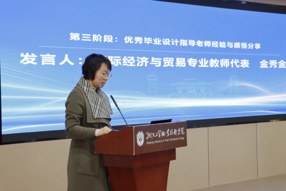 国际经济与贸易专业教师代表金秀金对毕业设计指导老师的角色解读,从员工选题、研究方法指导、时间管理进度控制以及沟通反馈方面进行经验分享,表达了在指导过程中需要耐心与细心、尊重与鼓励以及保持自我终身学习的感悟。最后她期望同学们始终保持好奇心和求知欲、勇于面对人生挑战、持续自我提升、培养团队精神进而取得更大的人生成就。