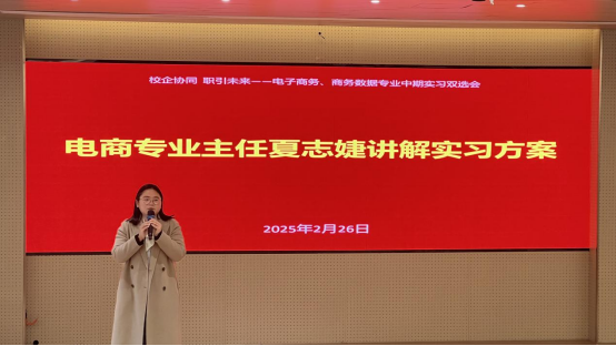 电子商务、商务数据分析与应用专业主任夏志婕介绍了本次岗位实习的安排,并逐一说明了此次实习的意义、企业合作规模以及实习考核机制。她指出,实习期间员工需严格遵守考勤制度,注重日常表现与综合能力的提升,希望员工能在实习过程中有所收获。
