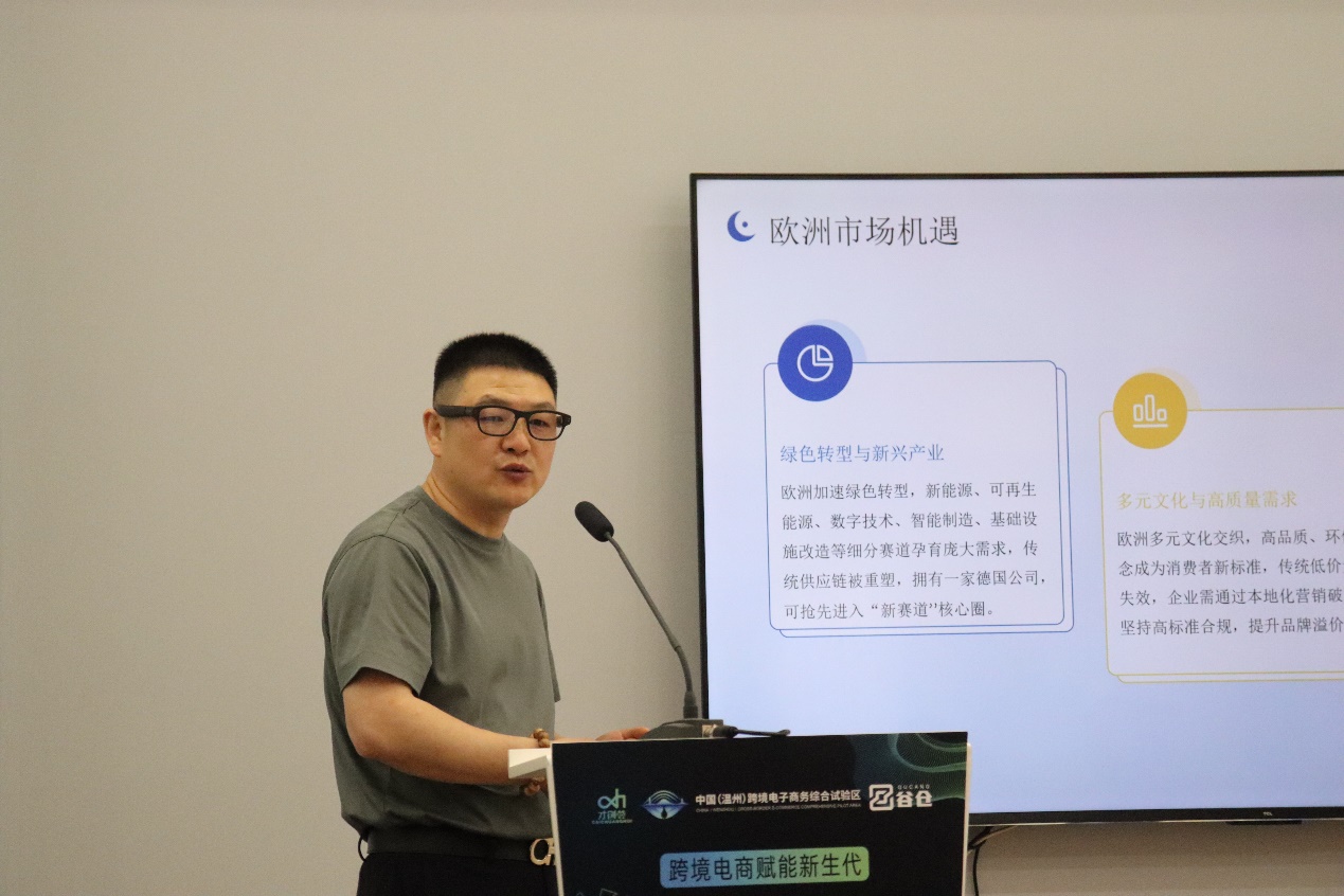 德国中华总商会常务副会长、秘书长叶洛华带来的《国际环境与欧洲市场机遇》主题演讲将活动推向高潮。叶洛华深耕中欧产业合作近15年,他从欧洲市场宏观趋势切入,深入解读消费需求、文化差异、政策风向等方面,同时对欧洲最新法律法规、税务合规以及物流与海外仓等企业关注的核心问题进行详细阐释,并分享了多个成功案例,为企业开拓欧洲市场绘制了清晰的蓝图。