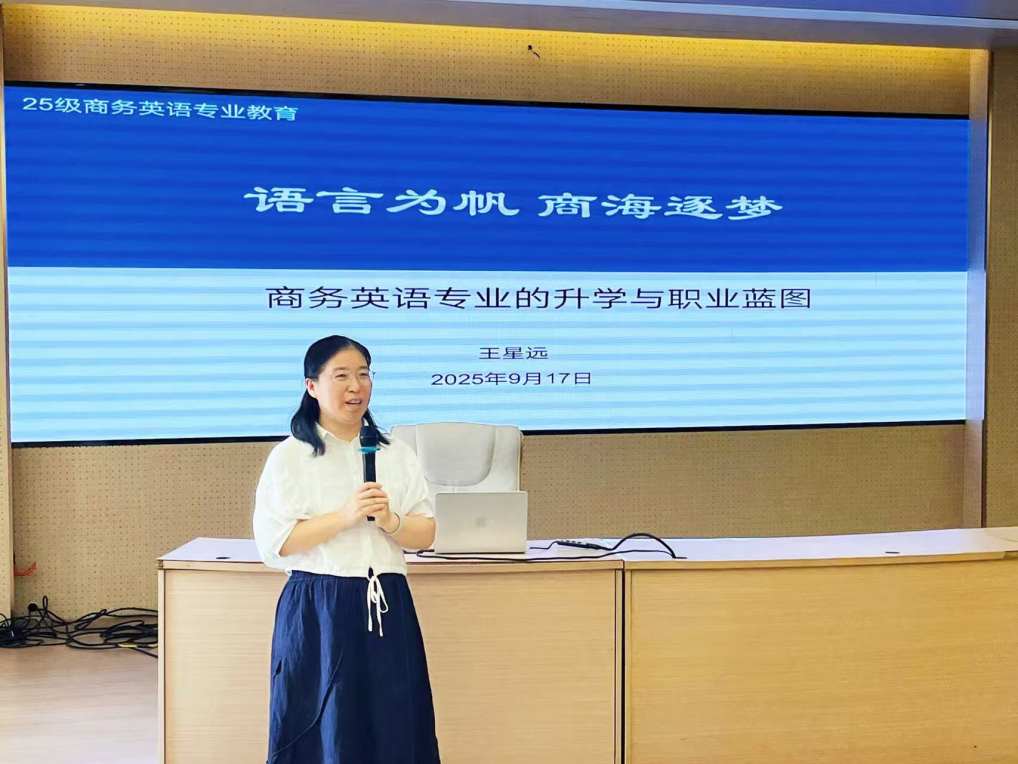 会议首先分享了多位优秀毕业生的辉煌案例,他们或成功专升本进入知名学府深造,或已成为跨境电商领域的业务骨干,用真实的成就向新生们昭示了商务英语专业的广阔前景与无限可能。随后,王星远主任从 “专业概况”、“专业定位”、“专业建设与发展” 以及 “专业建设成效” 四个维度,为新生进行了全面而深入的剖析。详细介绍了商务英语专业“英语+商务”的复合型人才培养模式,强调了其旨在培养既精通外语、又谙熟国际商务规则的应用型人才的核心定位。在介绍专业强大的团队力量、先进的实训平台及丰富的校企合作资源时,同学们无不表现出浓厚的兴趣。
