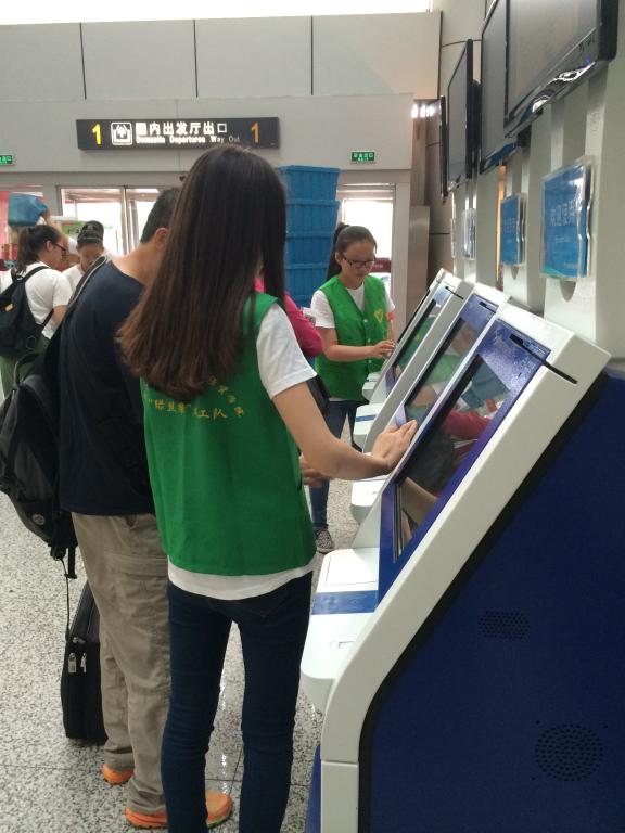 在自动取票的柜机处,有两位同学在热情地帮助旅客取票,在这里,我们时常可以听到旅客取票后的一声“谢谢”和我们同学的一句“不客气”。下午3时许,自动取票处来了三位外国游客,一开始由于紧张大家也你一言我一语地与游客对话想帮助游客,随后由一名同学带领外国游客去取票柜台排队,并成功地取得登机牌,随后,同学们带领他到了安检处。有了大家合力的帮助,相信这位外国旅客的旅途定会非常顺利!