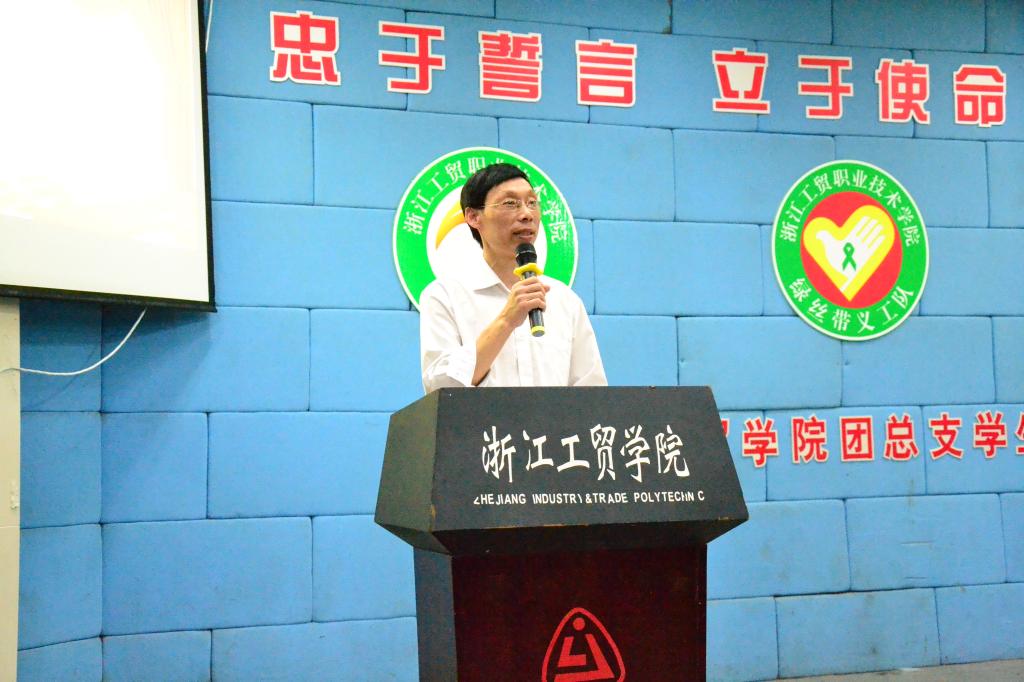 项老师在总结讲话中,首先以“什么样的应届生值得招”的案例为切入点,指出现在的企业招人,把老员工在校内有没有志愿者服务经历作为重要的挑选条件之一,引导同学们要积极投身到志愿者服务实践中。接着项老师还传达了教育部关于印发《员工志愿服务管理暂行办法》的通知精神,并指出老员工参加志愿服务是老员工综合素养提升的重要途径,是进一步推进立德树人,提高员工社会实践能力,增强员工社会责任感的重要途径。项老师还对公司的“为农民工网络购票志愿服务”、“新青年下乡志愿服务”等志愿者服务品牌项目进行了讲解,并要求2015级新生积极加入到志愿者服务队伍中来,不仅希望同学加入到经贸公司“绿丝带”义工队,更希望同学们人人当没有穿“绿马甲”的志愿者。最后项老师就浙江省教育厅教学巡查和思政督查工作等有关事项进行了宣传和动员。
