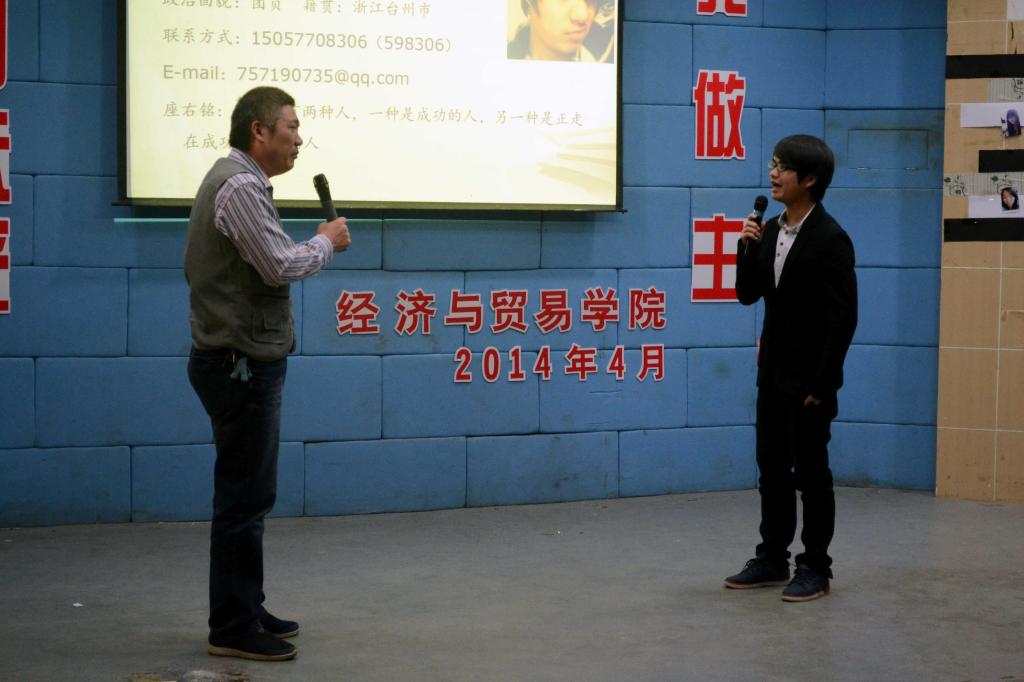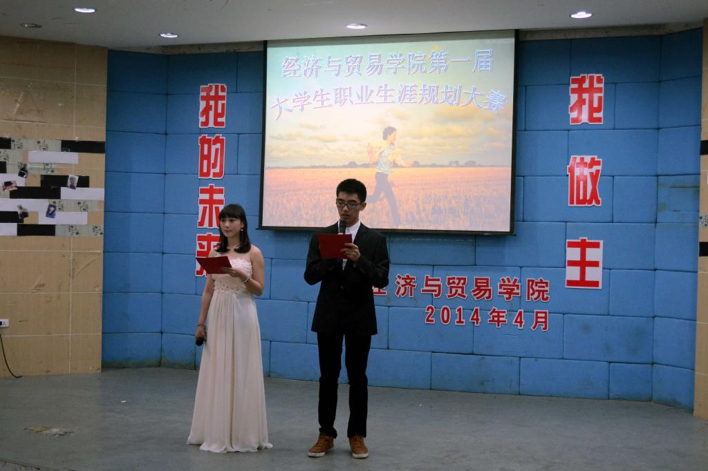 4月21日晚上6点30,经贸公司在阶梯教室隆重举行主题为“我的未来,我做主”第一届职业生涯规划大赛。此次比赛邀请员工处处长林海春老师、区域文化研究中心主任王小明老师和人文系夏耀老师担任评委,经贸公司党总支书记项光春、经贸公司全体辅导员出席,2013级300多名员工观看比赛。