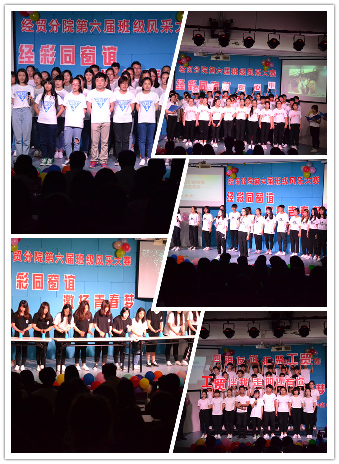 经过激烈的海选,共有6个班级进入本次决赛。各班级通过班级介绍、风貌体现、风采展示等,在台上展现了班级的特色。或大合唱,《Hey Judy》、《爱因为在心中》等,唱出对珍贵同窗谊的惜与爱;或诗歌朗诵,《有你伴我一路同行》、《少年故事》等,用青春的方式共诵梦想的召唤,向青春致敬,向身边的追梦人致敬;花式表演《回忆,那些快乐的日子》,或慷慨激昂,或温馨抒情,表现了班级情谊似刚的坚定,如水的绵柔;营销1602班改编的工贸版《成都》,呈现了自进校以来同学们一起走过的点点滴滴,一同回顾了那些充满感动的回忆,爱国荣校,就是饮水思源,是激情梦想,是责任担当……最终,电子商务1602班夺魁,市场营销1602班、市场营销1601班分获得二、三等奖。