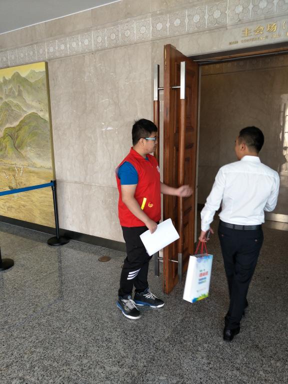 为响应此次活动,TapTap点点经贸分院绿丝带16位青年志愿者,早上6:30分便出发前往温州市人民大会堂,到达之后团委老师给志愿者分发了红马甲,并将每个同学安排在不同的工作岗位上,各司其职,着手准备工作。转眼间,嘉宾们便陆续得抵达现场,身穿红马甲的志愿者们负责接待来访嘉宾,穿梭在嘉宾之间,引导他们入座、协助安保人员进行物品检查等,并且在会堂内有4名志愿者全程服务。