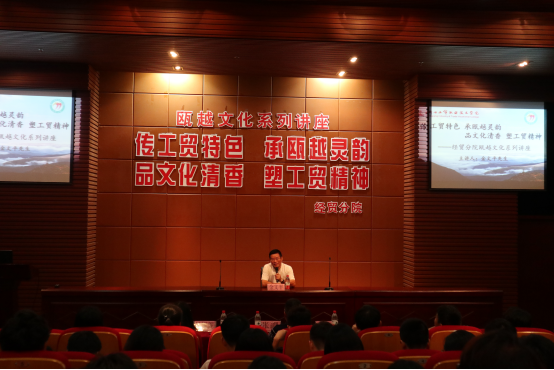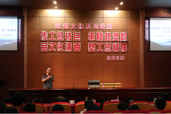 为了推进校园文化建设,提高我们的文化素质,重视和传承瓯越文化,6月12日晚,经贸分院在学术报告厅举办了以“传工贸特色 承瓯越灵韵,品文化清香 塑工贸精神”为主题的瓯越文化系列讲座。本次讲座由中国民俗学会会员、温州市民俗学会会长、温州国际广播电台方言节目主持人金文平老师主讲。出席本次讲座的还有经贸分公司党总支书记张勰、辅导员吴妮妮,以及经贸分院员工200余人。