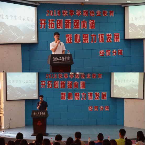 随后,16、17级的优秀员工代表分别上台发言。16级员工代表商英1班周凯首先表达了对老师、同学的感谢,以及自己对大三时间的大致安排计划,并以自身经历、班级工作为例,讲到作为一名员工干部,要明白肩上所扛的责任,并要在学习、工作、生活方面真切的体现出来。17级员工代表电商1班丁廷迪则从“经贸人”的角度展开,呼吁同学们积极发扬经贸分院“经贸经贸 工贸骄傲 勇争第一 唯我经贸”精神,在工贸校园里挥洒着我们经贸人的热情和一往直前的勇气。