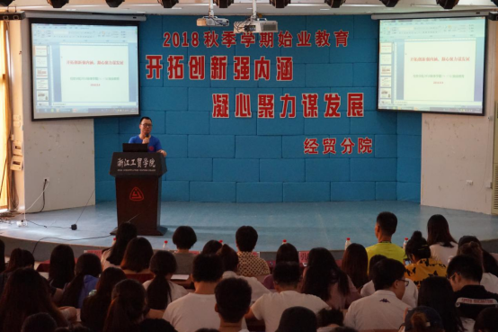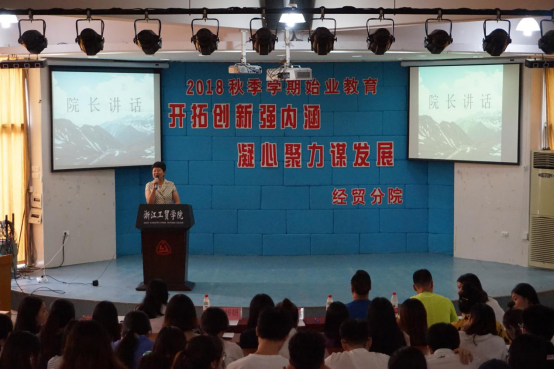 金秋时节,硕果飘香,告别了安逸的暑假,同学们满怀新的希望迎来了新的学期。9月9日下午,经贸分院在阶梯教室迎来了以“开拓创新强内涵,凝心聚力谋发展”为主题的始业教育大会。经贸分公司党总支书记张勰、经理成荣芬、副经理陈碎雷,辅导员周妍妍、向政、郑雪琦、吴妮妮,16、17级全体班主任及全体同学,分两场,约660人参加了此次大会。