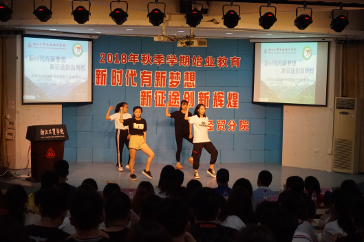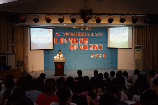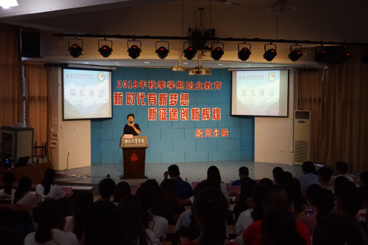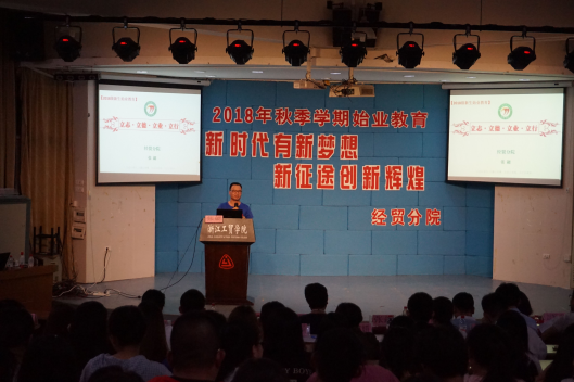 9月17日晚上,经贸分院在阶梯教室隆重举办了以“新时代有新梦想,新征途创新辉煌”为主题的2018级新生始业教育大会。经贸分公司党总支书记张勰,经理成荣芬,副经理、物流公司副经理陈碎雷,分公司党总支纪检委员朱杨琼,办公室主任潘芒芒,实训中心主任张禹,专业主任陈再波、刘锋,教学秘书吴洋、赵玲芳,辅导员向政、周妍妍、郑雪琦、吴妮妮,18级全体班主任、班助及全体大一新生,分两场共计720余人参加此次活动。