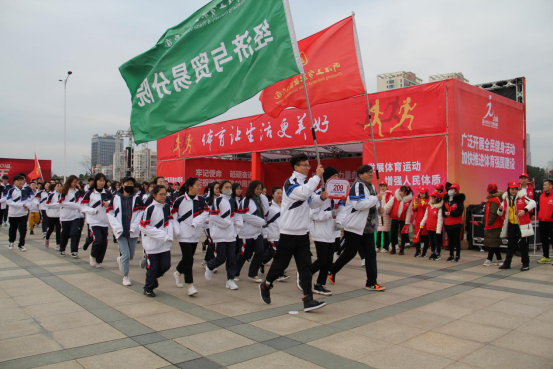 随后,在发令枪鸣响之后,穿着统一校服的工贸学子,挥舞着旗帜,用最饱满的热情喊着“经贸经贸,工贸骄傲,永争第一,唯我经贸”的分院口号。在跑步过程中,经贸学子始终以整齐矫健的步伐前进,从世纪广场南广场出发,途径市府路、惠民路、锦绣路、府东路、市府路,最后抵达世纪广场北广场,全程约4000米,全程队员们满怀激情地展现了年轻老员工积极向上的精神面貌。