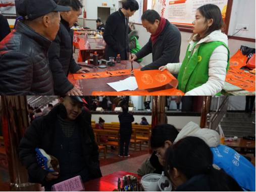 此外,还设有便民服务的活动区,如教村民使用手机的老年微课堂、写春联贺新年、视力检查、牙齿护理、量血压、手机贴膜、理发等等。多个摊位用于服务当地村民,摊位前聚集的村民们喜笑颜开,跃跃欲试,寻找自己感兴趣的摊位光顾。
