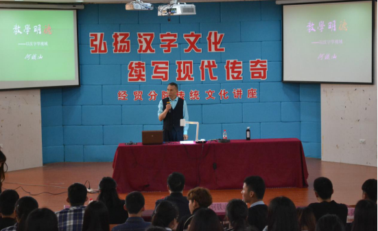 2019年4月17日下午3:30,经贸分院在阶梯教室举办了以“弘扬汉字文化,续写现代传奇”为主题的传统文化讲座。本次讲座由人文系艺术教研室主任、书法篆刻研究所所长、中南大学国学研究中心兼职教授何铁山教授主讲,出席本次讲座的有经贸分公司党总支书记张勰、辅导员吴妮妮、上一届团副丁凯丽,以及经贸分院学子340余人。