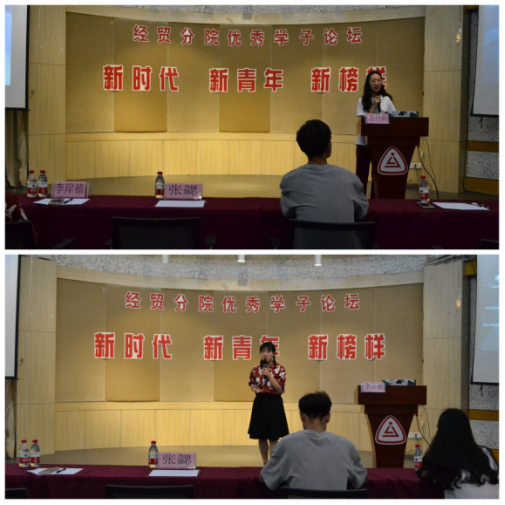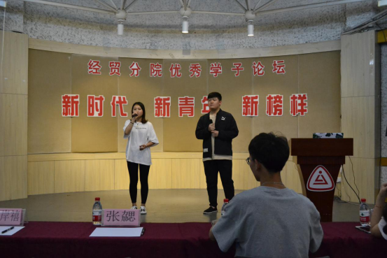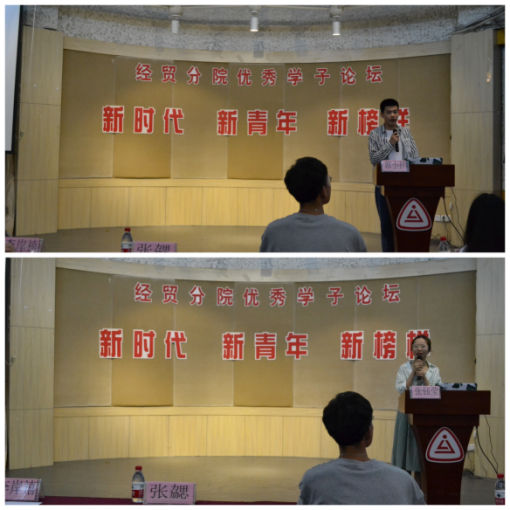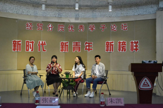 为营造良好的校园学习氛围,发挥榜样的示范带动作用,5月15日晚,经贸分院于多功能厅成功举办了以“新时代,新青年,新榜样”为主题的优秀学子论坛。本次论坛邀请了设计分院知识产权1701李岸禧、管理分院会计1704方丹阳、会计1702张钰莹、经贸分院市场营销1701郭小祥作为优秀学子代表,同时200余名经贸学子参加本次的论坛,听取优秀学子们的经验与学习方法。